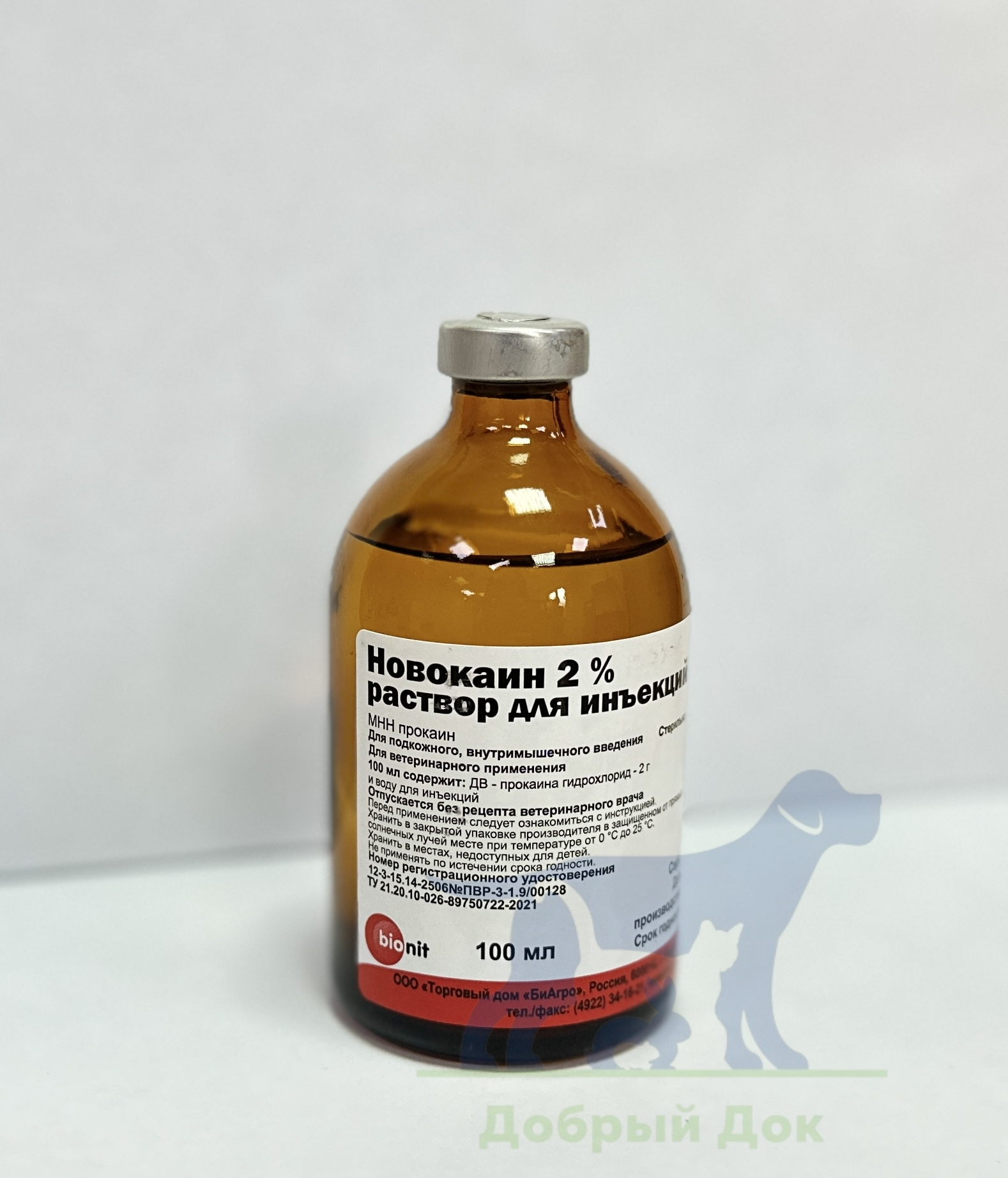 Новокаин блокирует натриевые каналы, вытесняет кальций из рецепторов, расположенных на внутренней поверхности мембраны и, таким образом, препятствует генерации импульсов в окончаниях чувствительных нервов и проведению импульсов по нервным волокнам. Подавляет проведение не только болевых, но и импульсов другой модальности. При внутривенном введении оказывает общее действие на организм животных, уменьшает образование ацетилхолина и понижает возбудимость периферических холинреактивных систем, оказывает блокирующее влияние на вегетативные ганглии, уменьшает спазмы гладкой мускулатуры, понижает возбудимость мышцы сердца и возбудимость моторных зон коры головного мозга. В токсических дозах вызывает возбуждение, затем паралич центральной нервной системы.