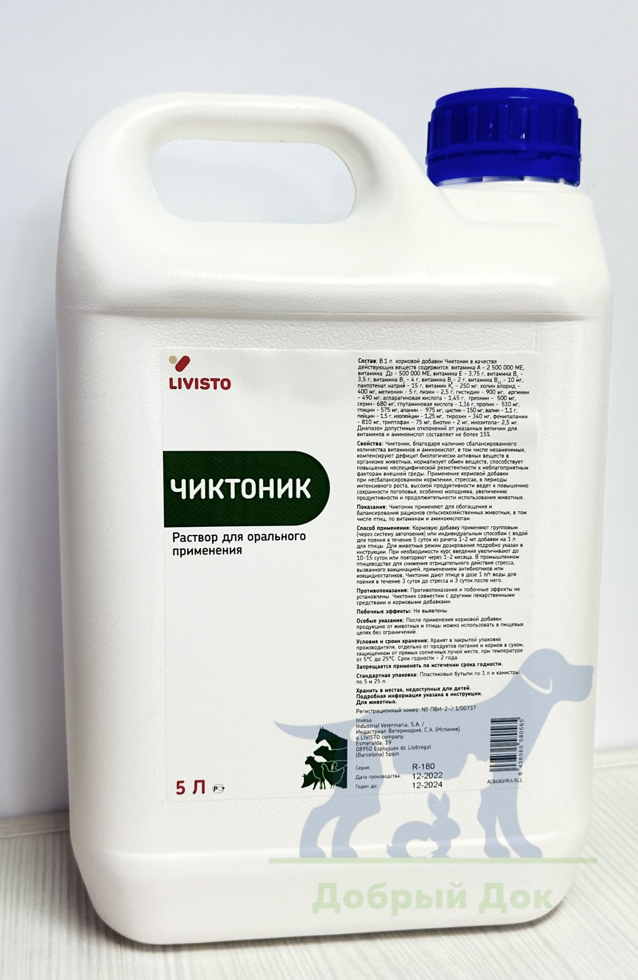Комплексный витаминно-аминокислотный препарат, регулирующий оптимальное соотношение этих биологически активных соединений, поступающих в организм животных и птиц. Препарат благодаря наличию сбалансированного количества водо-, жирорастворимых витаминов и незаменимых аминокислот, восполняет дефицит этих элементов в организме животных и птиц, способствует нормализации обмена веществ и энергии. Применение Чиктоника стимулирует рост и развитие ремонтного молодняка и птенцов, у кур-несушек повышает яйценоскость, у продуктивных животных значительно повышаются среднесуточные привесы, повышает фертильность животных, снижает эмбриональную смертность. Улучшает аппетит, повышает устойчивость организма к стрессам и инфекционным заболеваниям, оказывает положительное влияние на состояние кожно-волосяного покрова и оперения у птиц. По степени воздействия на организм теплокровных животных Чиктоник относится к малоопасным веществам и в рекомендуемых дозах не оказывает эмбриотоксического, тератогенного и сенсибилизирующего действия.Назначают сельскохозяйственным животным, птице и кроликам для профилактики нарушений обмена веществ, витаминной и белковой недостаточности. Для стимулирования общего роста и развития молодняка, повышения продуктивности и неспецифической резистентности. Для профилактики и лечения стрессов и отравлений. После проведения вакцинации и длительного лечения антибактериальными препаратами.